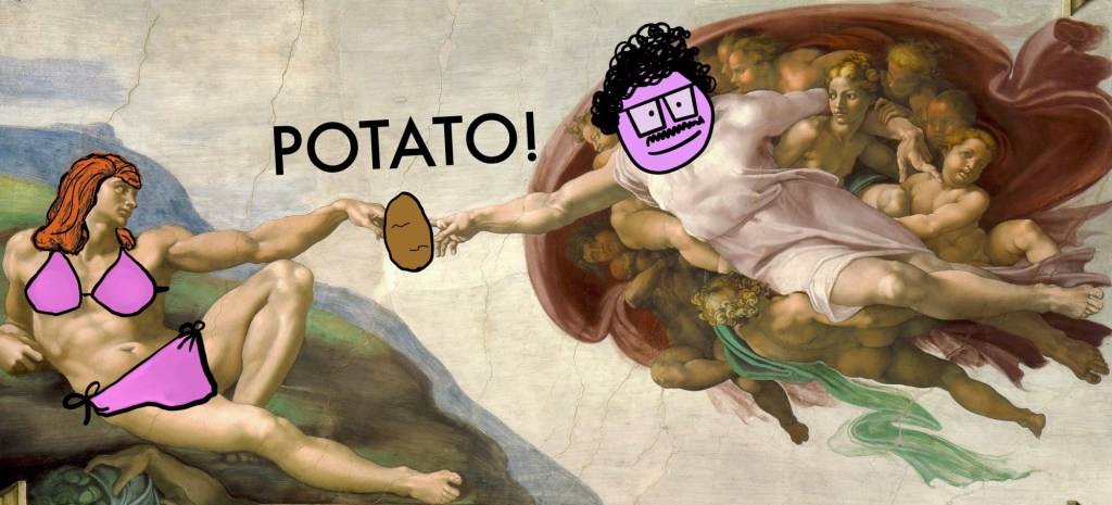 Human #1: “I will – In fact, I just decided my name – the name of the very first human ever will forever commemorate your benevolence! My name will from this day forward shall be POTATO!” And so it was – the first human on Planet Earth was named Potato.